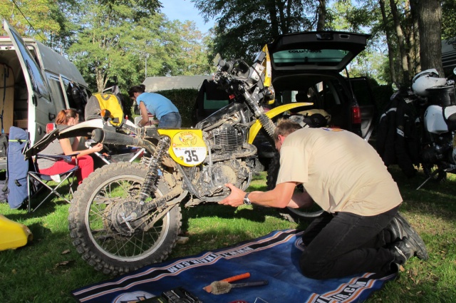 In St. Witz laden wir aus und bringen die XTs in den Parc Fermé. Wir erledigen die Dokumentenabnahme und die technische Abnahme. Außerdem lernen wir Jörg V. kennen (auf dem Foto der zweite von Links), der schon letztes Jahr auf seiner gelben XT dabei war.