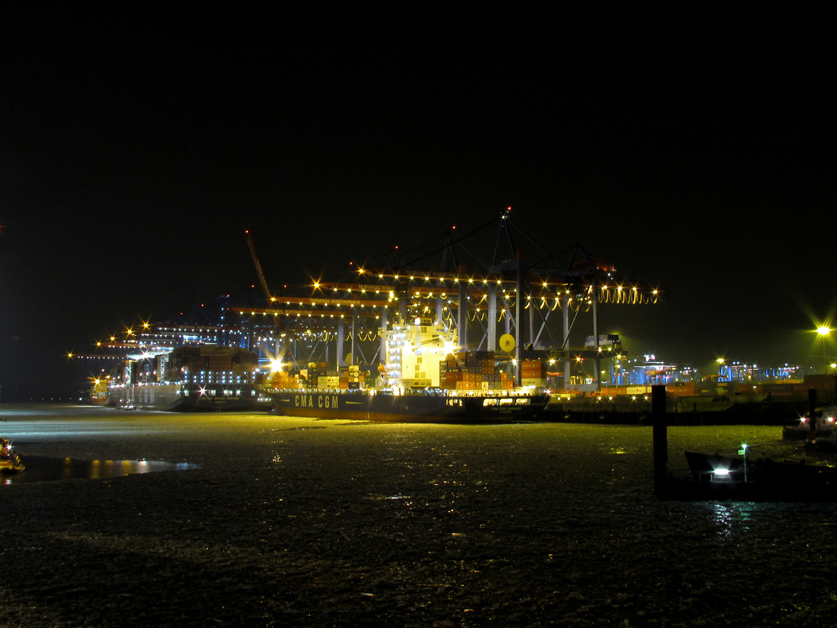 Im Sonnenuntergang gegen 21.00 Uhr startet dann eine kleine Gruppe von etwa 18 XTs zur Nachtausfahrt. Erster Stopp ist das Hafenmuseum, zweiter der Fähranleger gegenüber den Landungsbrücken.