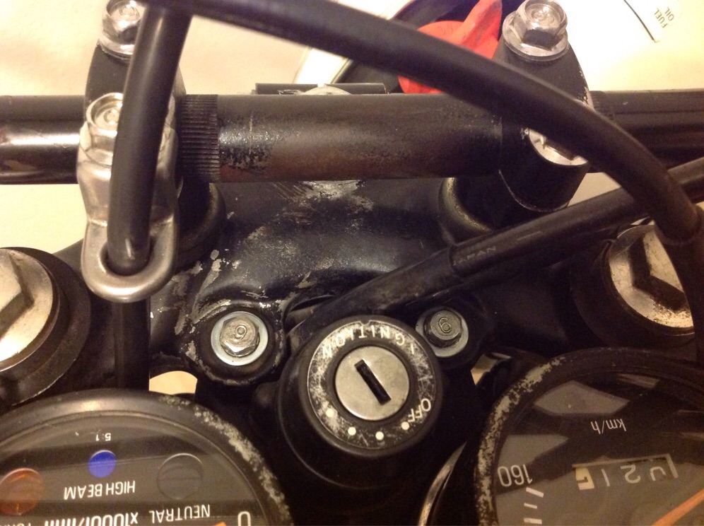 ...und zum Abschluss des Tages ärgere ich mich noch einmal richtig. Das Gewinde, in dem der (offensichtlich nicht originale) linke Spiegel sitzt ist blöd aufgebohrt