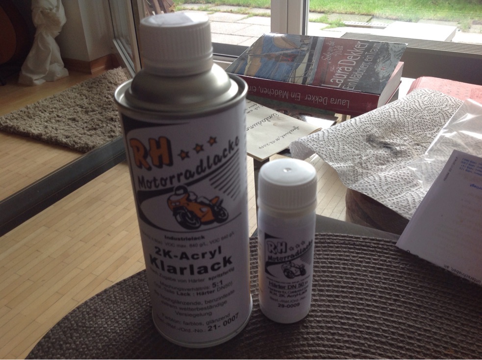Dann stand in der Beschreibung weiter: da der Aufkleber nicht resistent gegenüber Benzin und anderen Lösungsmitteln ist, empfehlen wir, die beklebten Bauteile danach klar zu lackieren. Das habe ich dann mit Hilfe des unten abgebildeten Klarlacks & Härters gemacht. Es glänzt nun etwas. Aber ich beobachte mal, wie sich das weiter macht.