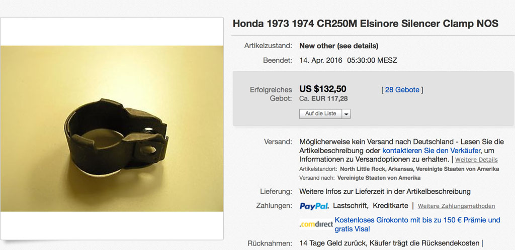 2.: 32 mm Auspuffschelle (Stahl) für 120 €. Bei letztgenannter handelt es sich wohlgemerkt nicht um ein Angebot, sondern um das tatsächliche Höchstgebot einer Auktion nach 28 Geboten. Mir fehlt dieses Teil auch. Nach dieser Auktion übrigens immer noch ...