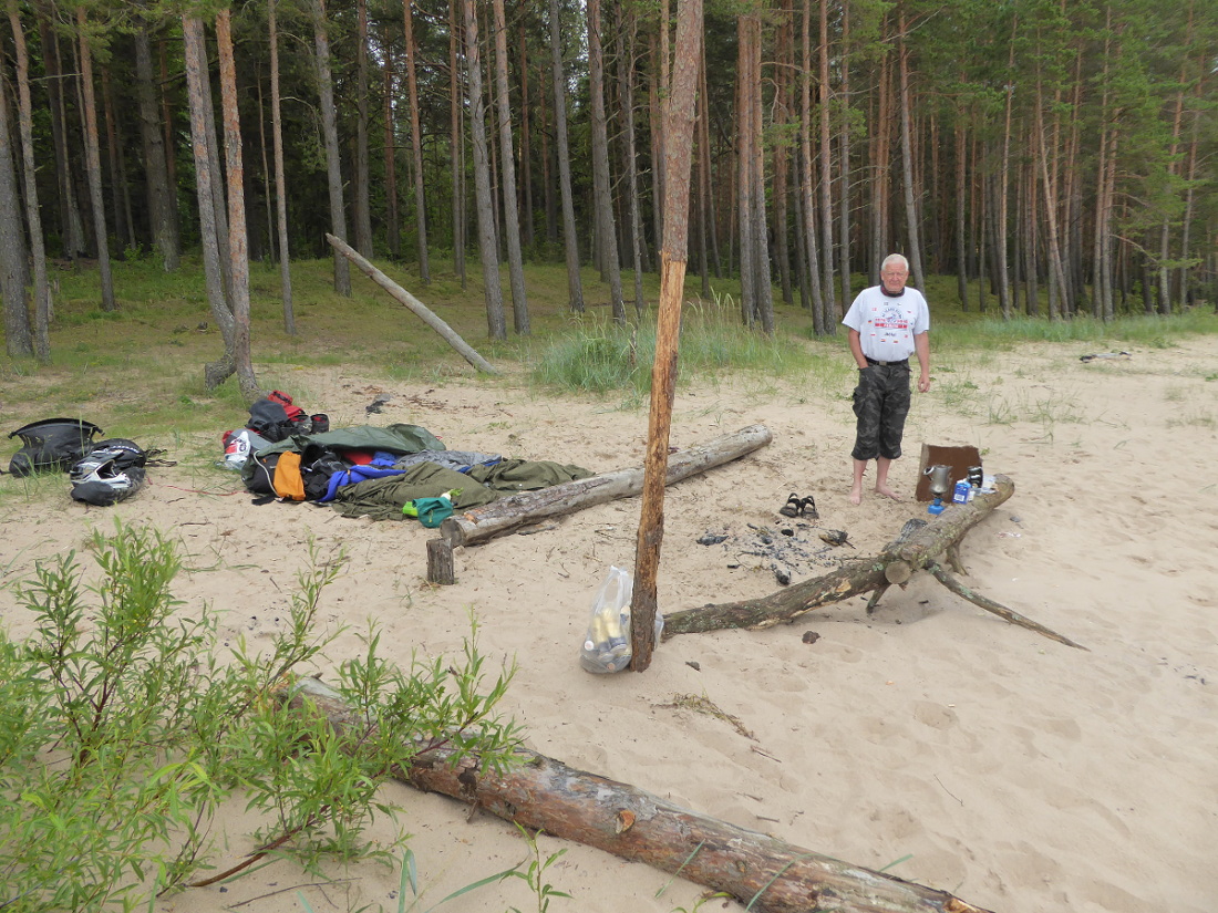 Richtung Meer orientiert, entdeckten wir die Straße nach Narva-Jõesuu und fanden relativ schnell einen kleinen, gewundenen Pfad durch den Kiefernwald, der uns an einen wunderschönen, breiten Strand mit einer Bachmündung führte. Der Ort wurde offensichtlich öfter benutzt, Baumstämme luden zum Sitzen ein, Feuerstelle war parat, Treibholz ohne Ende und den Müll räumten wir auf.