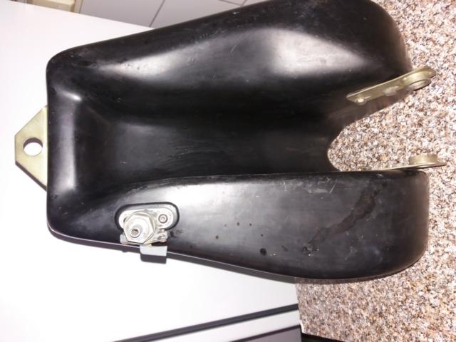 Er ist aus durchgefärbten schwarzen Kunststoff, Fassungsvermögen ca. 18L, er hat verzinkte Halter mit denen er auf die XT500 ab Bj. 80 passt. Benzinhahn wird der Originale von der 500er verwendet - Tankdeckel nicht. Die Einfüllöffnung hat ca. 50mm Durchmesser. Der Deckel der jetzt drauf steckt, ist vermtl. nicht der Originale sondern eher von einem Kanister...