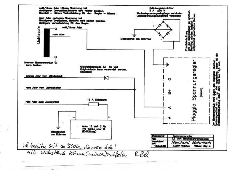 Normalerweise haben RollerLiMas heutzutage mehrpolige Magnete, und deshalb eine höhere Frequenz. Angeschlossen werden beide Enden einer Spule (wie bei der alten XT600). Hat man eine niedrige Frequenz(vierpoliger LiMaMagnet) und ein Ende der Spule an Masse, ist es scheins vorteilhaft, die Sollspannung des Reglers um die Vorwärtsspannung zweier in Reihe geschalteter Dioden anzuheben. Das ist scheins der einzige Unterschied, keine Ahnung. So Rollerregler gibts halt schnell mal billig beim Zweiradschlachter oder in der E-Bucht.Ganz versteh ich die Chose nicht ... 12V-Regler die man da reinhängen kann gibt es ja eh, Stichwort Amiregler für Sparsame oder Kedoregler oder Rexregler, alle mit Originalverkabelung und nur mit Originalleistung. Die einen mit integrierter Gleichrichtung und die anderen mit separater Diode.