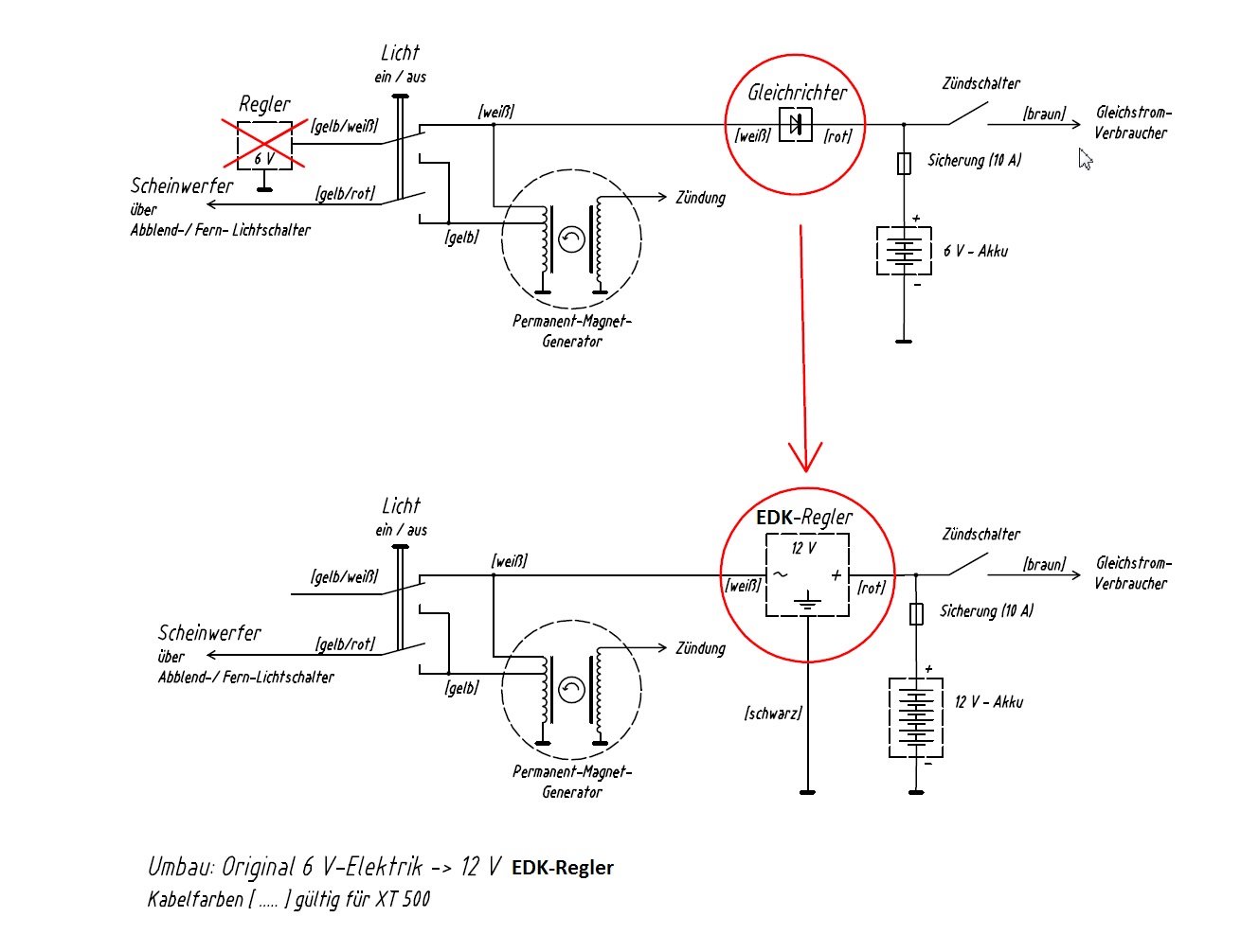 Der EDK-Regler/Gleichrichter wird angeschlossen wie der Robin-Regler (ich vermute er funktioniert auch ähnlich), d.h. das gelb-weisse Kabel läuft ja ins Leere. Der Regler sitz ja jetzt an der Stelle des 6V-nur-Gleichrichters.