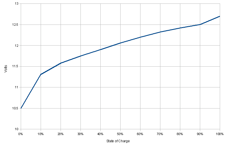 Für meine Zwecke der Kontrolle hat es bisher völlig ausgereicht, ab und an schnell einmal mit dem Multimeter die Ruhespannung zu messen, um über den Ladezustand informiert zu sein, wofür diese Kurve ganz gute Dienste leistet, die sich irgendwann irgendwo im IN fand: