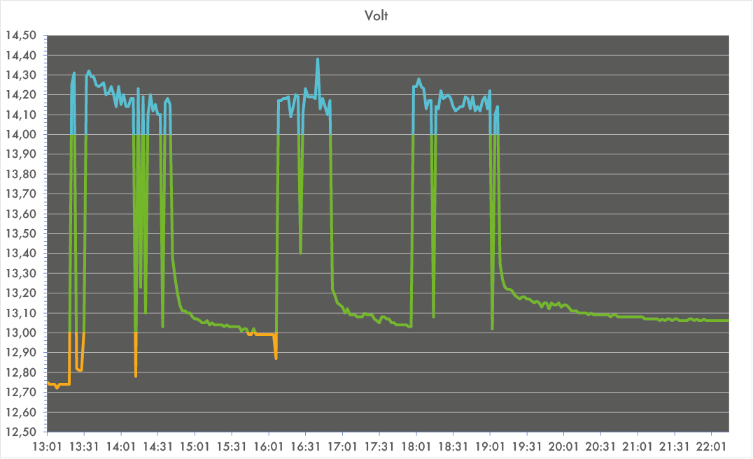 Schön ist das der spannungsverlauf über lange Zeit protokolliert wird. Kommt man mit dem Handy in Reichweite wird es übertragen. Es zeigt aber auch livedaten und den Verlauf der letzten 5min an.