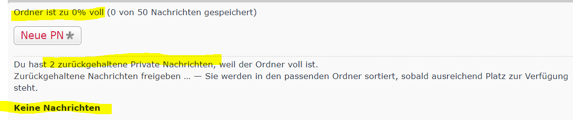 Habe extra die Stellen gelb markiert. Ich habe schon fast alles gelöscht bis auf 2 mails. Ordner zu 4% gefüllt. Muss ich jetzt immer alles 100% löschen, damit ich pn's bekomme?