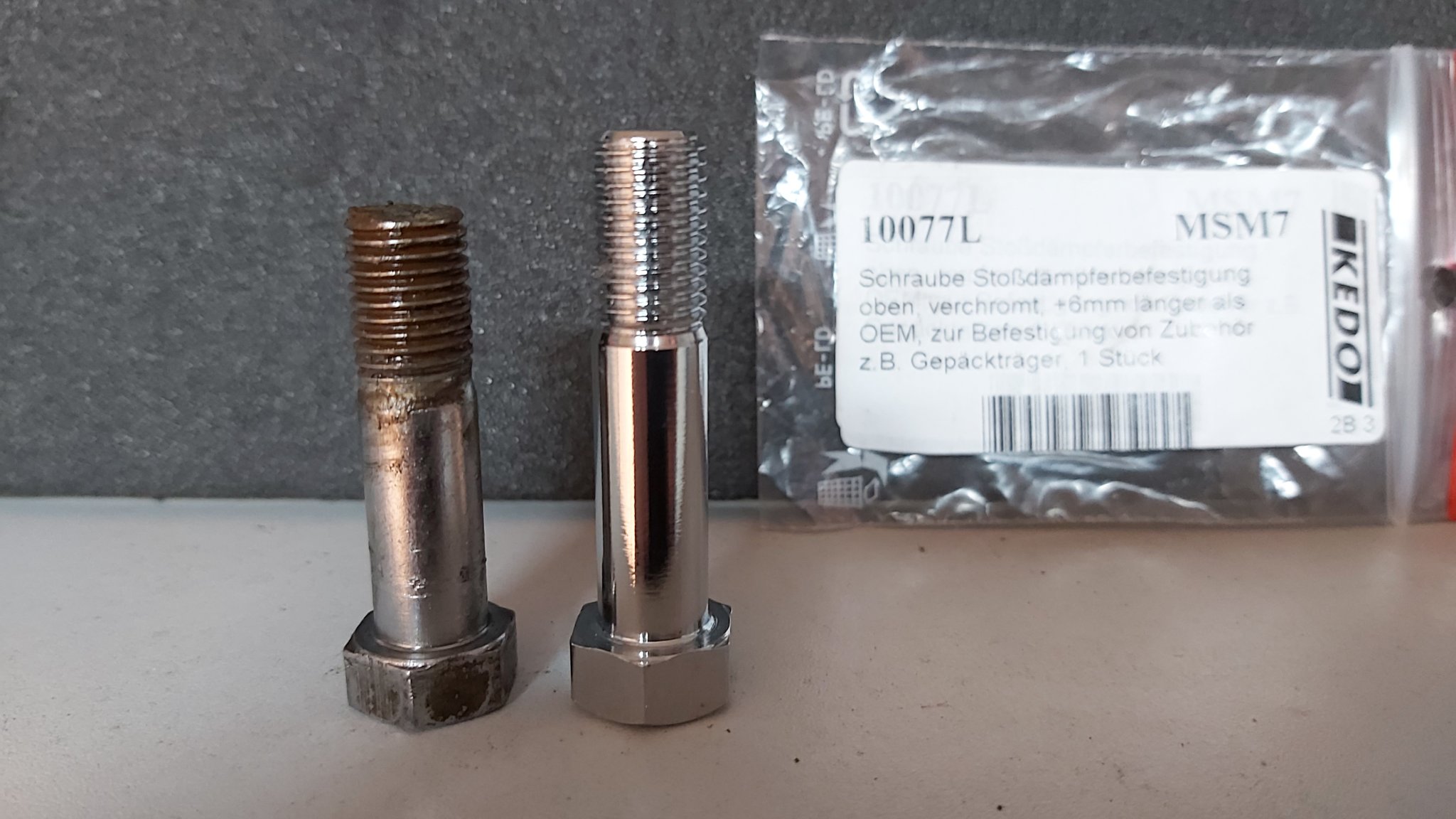Bei meiner Suche nach den richtigen Schrauben, mir war die Schaftlänge wichtig, bin ich bei Kedo fündig geworden. Allerdings nicht im Katalog, sondern im Online Shop. Die Schrauben sind perfekt von der Länge, der Schaft ist lang genug, damit das Federbein nicht auf Gewinde aufliegt.