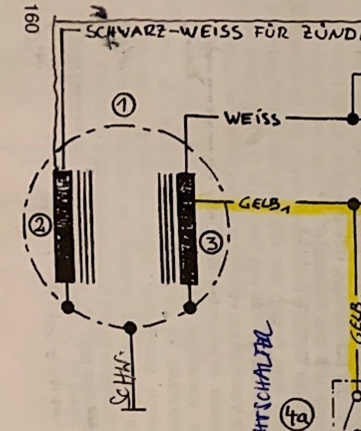 Eigentlich handelt es sich um nur eine Spule, deren oberes Ende mit der für die Ladung des Akkus nötigen höheren Spannung per weißer Ader über Regler und Gleichrichter eben dorthin führt, während der Abgriff an geeigneter Stelle zuvor an der Spulenwicklung eine niedrigere Spannung abzweigt, die per gelber Ader direkt und als Wechselspannung zum Lichtschalter und zu den empfindlichen Glühlampen der Beleuchtung geht ...