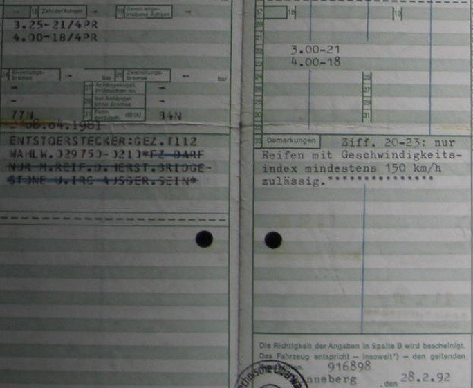 es ist unglaublich welche Eintragungen es gibt, je nachdem wann und wie man etwas hat eintragen lassen. Bei meiner Ur- XT habe ich 1992 die 3.00 - 21 nachtragen lassen. Dabei wurde die Reifenfabrikatsbindung mit Kugelschreiber durchgestrichen, dafür ein Geschwindigkeitsindex hinzugefügt.