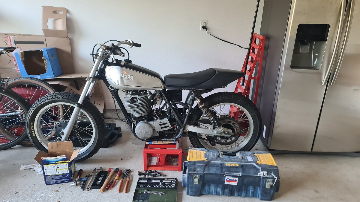 Da ich es nicht geschafft habe meine XT's in die USA zu bewegen und die Möglichkeiten auch nicht besser werden habe ich mir im Bundesstaat Texas eine mehr schlecht als recht erhaltene TT gekauft und nach Alabama transportiert. Interessant war daran das es sich um einen ehemaligen Sanbahnrenner handelte und der Rahmen umgebaut worden ist. Vorne ist eine 17.5 Zoll Felge (muss ich nochmal genau schauen) und hinten die normal 18er.