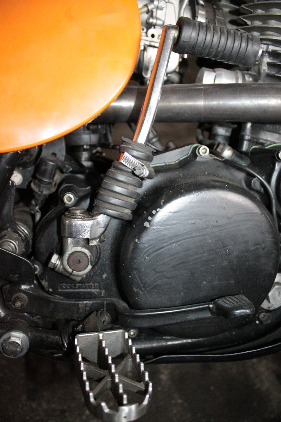 Damit das jetzt mal stabil bleibt, habe ich den harten Schlag bei meinen XTs mit einem alten Fußrastengummi abgedämpft. Wenn's nicht schicki schicki sein muss, ist eine gute Lösung, vielleicht fällt mir ja noch was hübscheres ein. Das Kickstarteranschlagblech im Motor würde ich übrigens auch nicht wieder reparieren (wenn es abgebrochen ist) bzw. ich würde es ausbauen (wenn es noch ganz ist). Ich habe im Laufe der Jahrzehnte das abgebrochene Stück schon drei mal aus der Ölwanne gefischt oder musste es von der Kuppplungsseite rausholen, weil es die Kickerzahnräder blockiert hat. Es gibt im Forum auch Bilder, wo es das Motorgehäuse beschädigt hat.