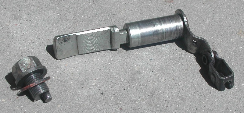 wird der Ausrückhebel betätigt, drückt die Fläche am unteren Ende des Ausrückhebels auf die Druckstange (dort wo die Abdrücke zu sehen sind). Der exzentrische Stift der Einstellschraube greift in die Nut am Ausrückhebel. Dreht man an der Schraube, bewegt sich also der Ausrückhebel hoch und runter. Da die Fläche die auf die Druckstange drückt schräg ist, kann somit über axiale Position des Ausrückhebels das Spiel eingestellt werden.