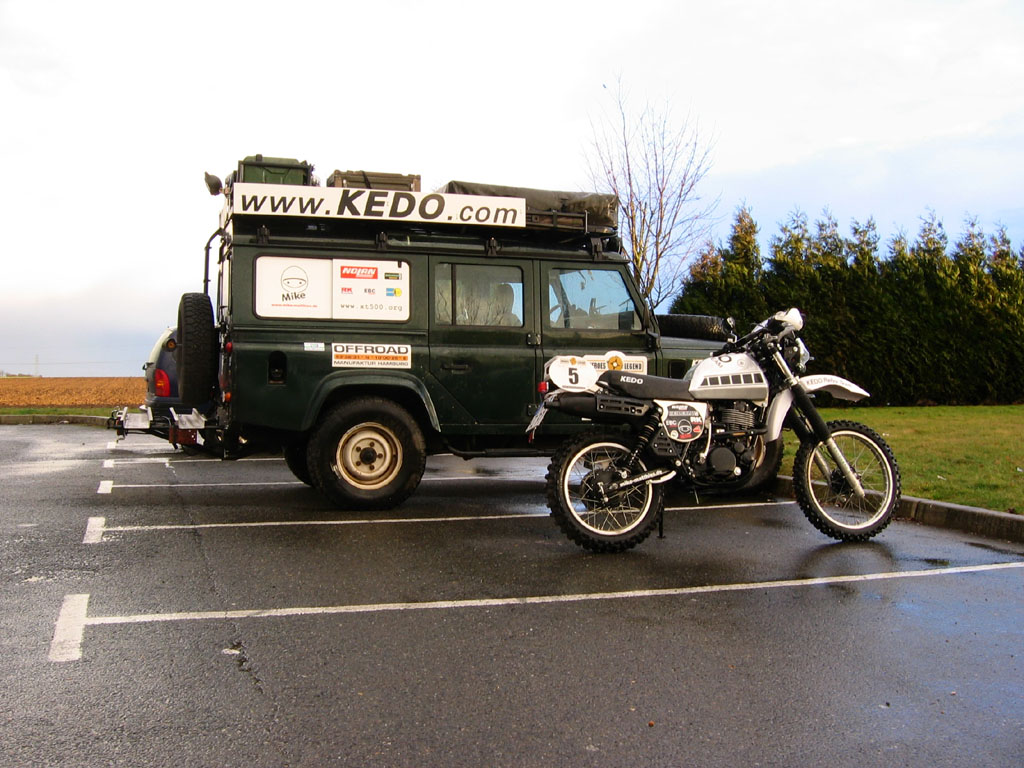 Nach dem Roadbook fahren wir durch Paris und zwei holländische Teams folgen uns blind. Beim Verlassen der Peripherique verlieren wir die Strecken und beraten uns kurz auf einer Busspur. Ich empfehle den Holländern nicht zu folgen, da ich nun nach GPS fahren möchte, aber die Holländer lachen nur, meinen es wäre zu spät, und folgen weiter. Wir haben Glück, schon kurze Zeit später sind wir auf der N20 nach Orleans. Nach etwa 70km machen wir Stopp bei einem Supermarkt, essen etwas und wechseln Fahrer bei der XT. Den Rest kann ich nun fahren, so ist jeder an diesem Tag mit der XT gefahren.