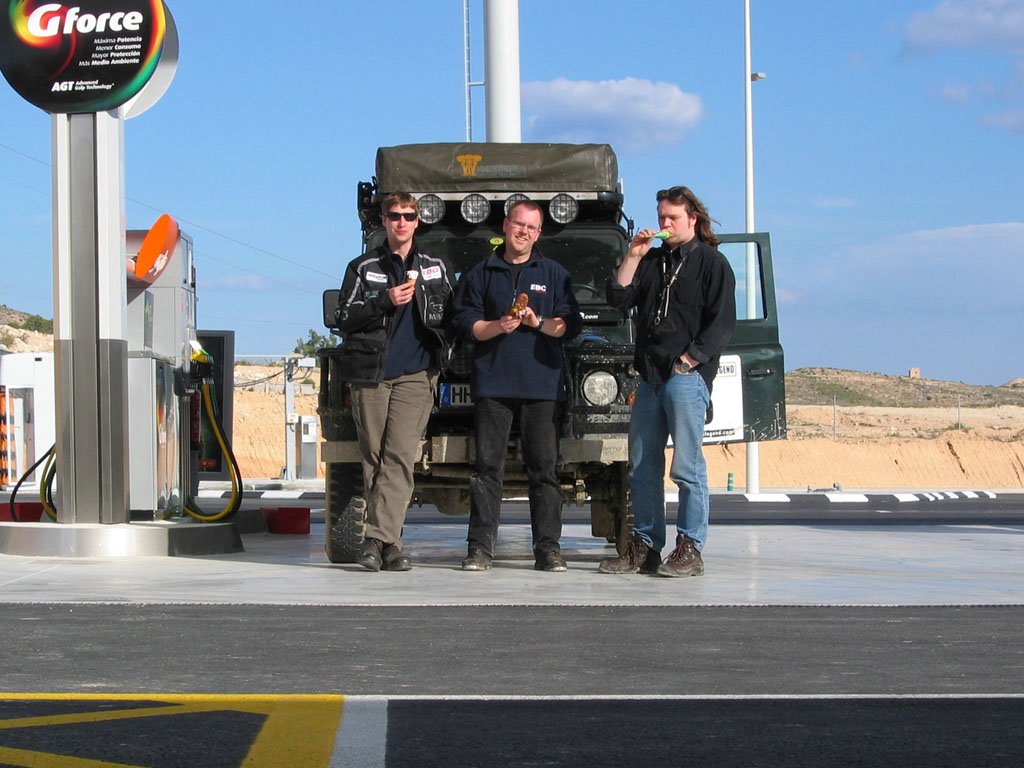 Danach wird der Heckträger wieder angeschraubt. Henk kommt vorbei und fragt nach unserer XT. Da Marco gerade angerufen hatte, konnte Lutz ihm berichten, dass Marco die XT nicht mehr anbekommt, es aber weiter versucht. Das Barbeque ist schon im vollen Gange, als Marco und damit die letzte XT ankommt. Henk freut sich und Lutz und ich noch viel mehr. Sofort wird die XT aufgeladen und die Bäuche beim Barbecue vollgeschlagen. Grinsend fragt Auriol Marco wo das Problem lag und Marco erklärt, dass er sich mit einer Gruppe von anderen Fahrern verfahren hat und außerdem die XT aus und nicht wieder angegangen ist. Es ist schon nach 13.00 Uhr als Team 5 endlich aufbricht. Über 80km sind es bis zur Autobahn, dann 440km bis zur Fähre. Laut Auriol sollen die Teams auf keinen Fall später als 19.30 Uhr im Hafen sein. Also geben wir Gas. Um 18.30 Uhr sind es laut GPS noch 30 km Luftlinie bis Almeria.