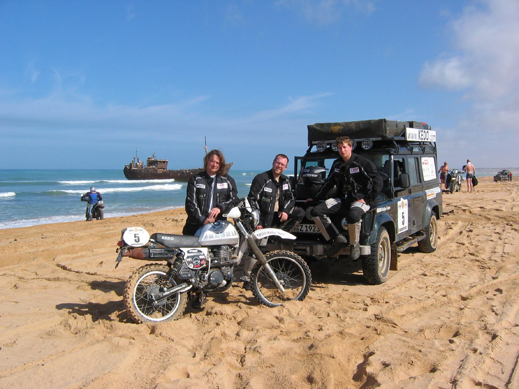 Es ist unser Ruhetag. In diesem Fall nur 290km Liaison. Frühstück ab 8.30 Uhr und Briefing um 9.00 Uhr fällt aus, da es nichts zu sagen gibt. Nach dem Frühstück dürfen wir in den Dünen und am Strand spielen und der Fotograf möchte gerne Team-Fotos machen. Gegen 11.00 Uhr bekommen wir von Auriol ein Roadbook für heute und morgen und fahren ab. Ich fahre die XT für 125km und suche ein Plätzchen für eine Rast. Wir finden eine Straße und ein Fischerdorf. Ein Fischer öffnet uns die Barriere und lässt uns an den Strand fahren. Unten finden wir ein Geisterfischerdorf vor mit einem menschenleeren Strand. Marco badet und wir duschen. Danach gibt es Pfannkuchen unter dem Sonnensegel. Super, besser könnte es uns nicht gehen. Irgendwann nach drei Uhr brechen wir auf und bedanken uns bei dem Fischer mit Resten aus unserern Lunchpaketen. Er fragt nach Whisky, doch wir haben ja keinen.
