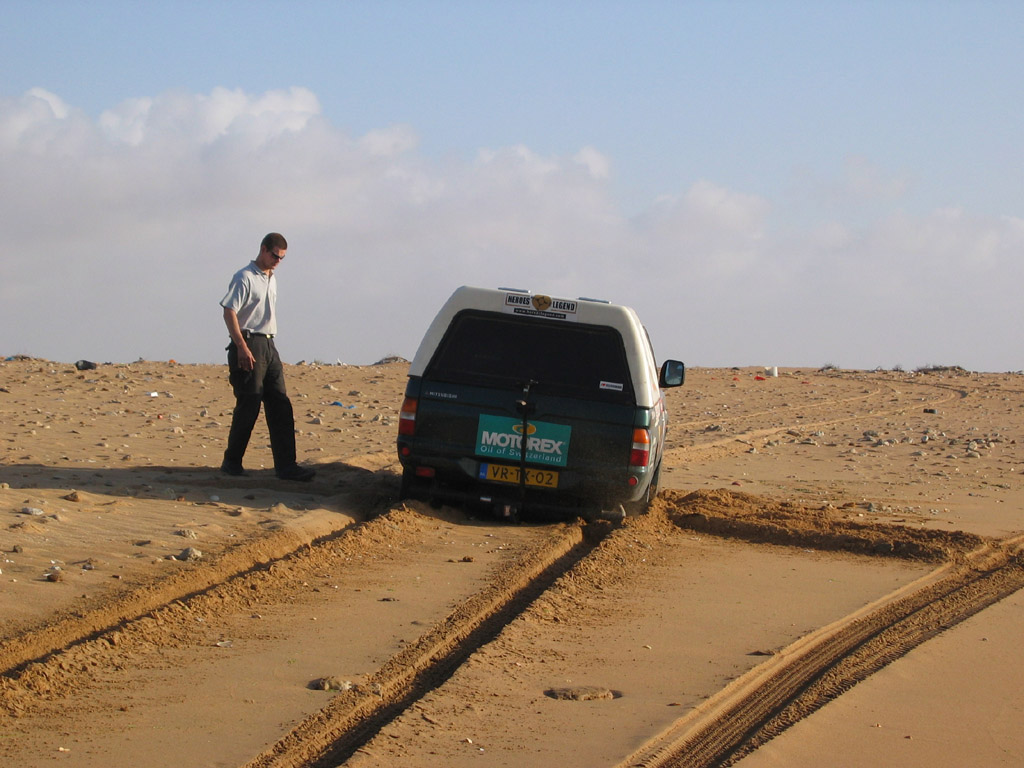 Zunächst fahren wir am Anfang des Konvois, doch schon einige Fotos später sind wir die Letzten. Als dann auch noch der Stoßdämpfer vorne rechts wieder zu klappern anfängt, sind wir allein. Wir lassen Luftdruck an den Rädern ab, als Auriol kommt, der die Strecke hinter uns schließen möchte. Also müssen wir uns beeilen. Aber schon wenige km später steht der Jeep in den Dünen mit einem Platten. Das ist gut, denn so gewinnen wir Zeit. Zusammen mit Team1 und dem Hummer suchen wir den Weg durch die Dünen, den wir aber irgendwie nicht finden können. Wir entschließen uns nach Westen zum Strand durchzuschlagen. Nach kurzer Zeit bleibt der Hummer zurück. Team1 und wir sind allein. Dass es 20km bis zum Meer sind konnten wir nicht ahnen. Wir hatten kein Roadbook und konnten auch mit den Waypoints nicht viel anfangen. Aber wo ein Wille ist, ist ein Weg und so erreichen wir nach Stunden den Strand. Hier kann man schön schnell fahren und auch zwei ORG 4x4s überholen uns. Vorbei an zwei tollen Wracks ballern wir den Strand entlang. Nach 30km kommen Felsen und wir müssen vom Strand runter. Gar nicht so einfach und schon steckt der PickUp von Team1 fest. Wir ziehen ihn zurück und schaffen es selbst nur knappt. Der Pickup schafft es mit schieben. Jetzt stößt der Landy Team7 auch noch zu uns. Außerdem der französische XT Fahrer Nr.2. Er hat sich auch total in den Dünen verfranzt und ist fertig. Später fährt er mit dem Doktor zum Ziel. Wir mittlerweile drei 4x4s schlagen uns nach Süden durch. Immer mal wieder geht es auf den Strand und zurück nach oben. Nocheinmal zieht der 7er Landy den 1er PickUp aus dem Sand. Glücklich erreichen wir einen kleinen Ort, von dem eine Piste zum Teer geht. Wir rufen Anne Marie an, dass wir ins Camp fahren und nicht zum Ziel ASS12.