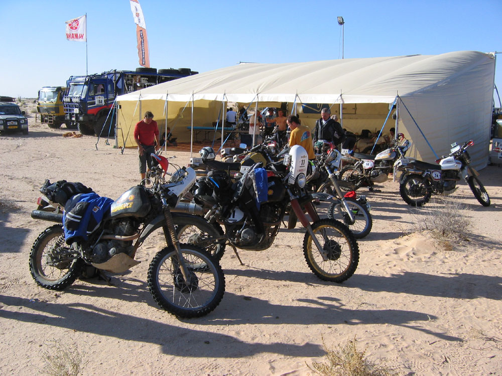 Was wir nicht wussten, wir können nach den XTs auch die SS fahren. Das machen wir natürlich. Reifenluftdruck auf 1,5 bar und um 12.15 Uhr los. Lutz und ich brauchen etwa 4 Stunden für die 160km. Marco hat auf der XT nur 2,5 Std. Zeit. Die Strecke ist schön und verläuft die meiste Zeit an Dünen entlang. Hin und wieder muß man über den Rand einer Düne fahren. Henk treffen wir auf der Strecke, er hat sich festgefahren, aber der Betonbauer zieht ihn wieder raus. Lutz und ich fahren alleine. Hier und da machen wir ein Foto, fahren aber ansonsten durch ohne lange Pausen. Am Wendepunkt treffen wir Abdul, Team7 mit einem Platten an der XT und den Betonbauer wieder. Kurze Zeit später noch Werner Team1, auch mit einem Platten. Vom Ziel ASS sind es nur noch 30km bis zu dem Camp direkt an den Dünen. Einige XTs und 4x4s versuchen sich schon darin. Wir treffen auf Marco, der aber keinen guten Eindruck macht. Er hat sich auf der SS überschlagen und den roten Knopf am IriTrack gedrückt. Sein Rücken und Becken fühlt sich nicht gut an. Es sind auch beide Medical Autos zu ihm gekommen, aber er ist die SS zuende gefahren und auch weiter bis ins Lager. Ihm ist kalt, was auf den Schock zurück zu führen ist. Der Doc kommt hin und wieder vorbei. Er lässt Marco eine Urinprobe machen und prüft mit einem Streifen, ob Blut im Urin ist. Nein ist nicht. Trotzdem lässt im Marcos Zustand keine Ruhe, so dass er nach dem Essen entscheidet mit ihm nach Nouakchott ins Krankenhaus zu fahren. Dort kann er röntgen und Ultraschalluntersuchungen machen. Lutz hat sich der XT angenommen, aber außer einem abgebrochenen Kupplungshebel, einem verbeulten Hitzeschutzblech und dem leicht verbogenen Lenker kann er nichts entdecken.