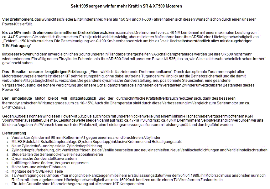 und gezahlt hab ich lediglich das Öl plus Filter.........Ventilspiel war noch gut (hat nix geklappert) und konnte am warmen Motor eh nicht kontroliert werden...........Zündung war auch nix dran zu machen, da ICH auf seinen Ratschlag hin schon auf SR-Lima mit CDI umgerüstet hatte.........so, nun aber für dich zur Beruhigung noch der entscheidende Satz von Michael und Sabine : "ALLE Einstellungen sind 1:1 wie beim Serienmotor!!!!!!!!!!" und somit von jeder Werkstatt bzw. jedem Selbstschrauber( wie ich z.B.) problemlos durchzuführen.