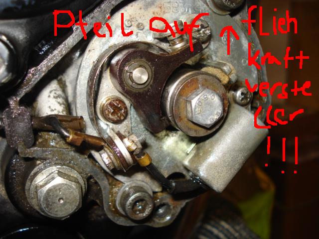 Alles geprüft, Kolben oben, Ventile zu,Markierung auf dem Zahnrad auf Kurbelwelle und das Zahnrad der Fliehkraftreglerwelle stehen sich genau gegenüber. Also Seitendeckel wieder drauf und der Fliehkraftversteller zeigt nun bei OT mit dem Pfeil nach unten und nicht nach oben...häääääääääää????