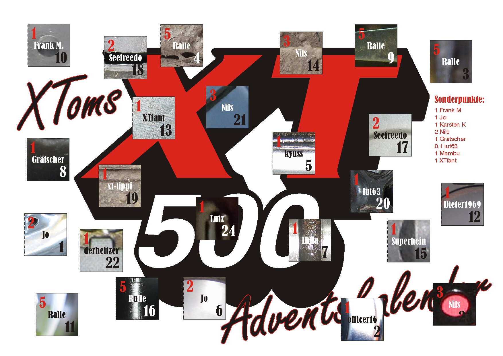 Und noch einmal einen herzlichen Glückwunsch zu dieser einmalig originellen Adventskalender-Idee! Unglaublich, welch schier unerschöpfliches Aufheiterungspotenzial Du damit freigesetzt hast! Hab echt schon lange nicht mehr so oft und so herzhaft außer der Reihe lachen müssen wie bei dieser höchst unterhaltsamen Flut von Beiträgen seitens der diversen XT-Besessenen! Einfach toll!!!