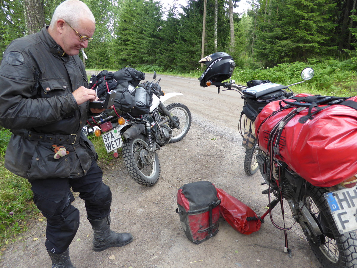 Ein netter Schnack mit einem Finnen, der deutsch sprach, half uns, das Richtige zu essen zu finden (schon bei Pommes komme ich in finnisch nicht mehr mit, die heißen dort ranskalaiset perunat, die Sprache hat 14 Fälle und ich bin da in den paar Tagen über "Pohutko saksa/englanti?" (Sprichst Du deutsch/englisch?) nicht hinausgekommen), dann packte Jens sein Telefon aus und nutzte das integrierte Navi, weil Anttis Streckenbeschreibung nicht eindeutig genug war.