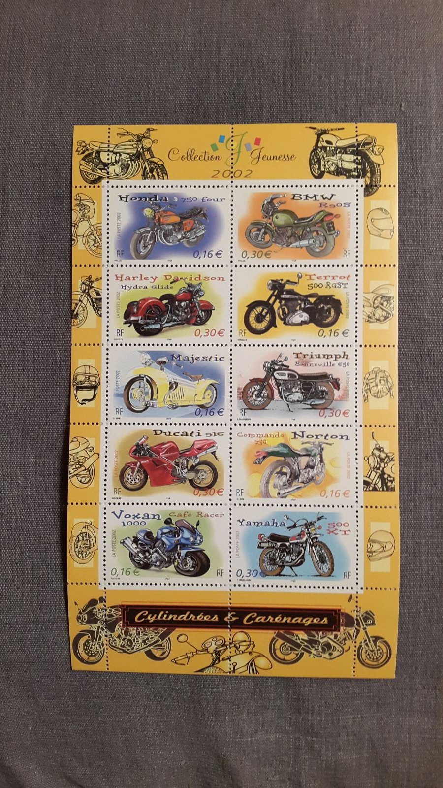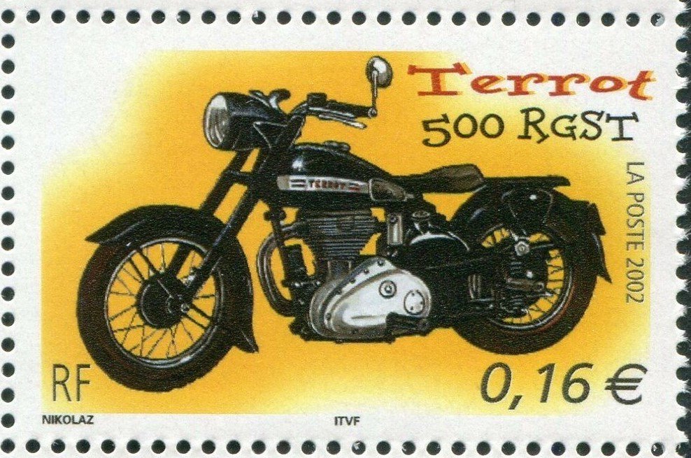 Kurz noch mal zurück zum Fabrikat TERROT aus Frankreich: das Modell 'Terrot 500 RGST', das als Basis für das weiter oben gezeigte Trial-Zweirad diente, ist ebenso wie unsere 'Yamaha 500 XT' im Jahr 2002 auf einem Briefmarkenbogen mit etlichen anderen mehr oder weniger historischen Motos gelandet, was es hier bei uns in solcher Form wohl noch nicht gab!? Oder etwa doch?!?