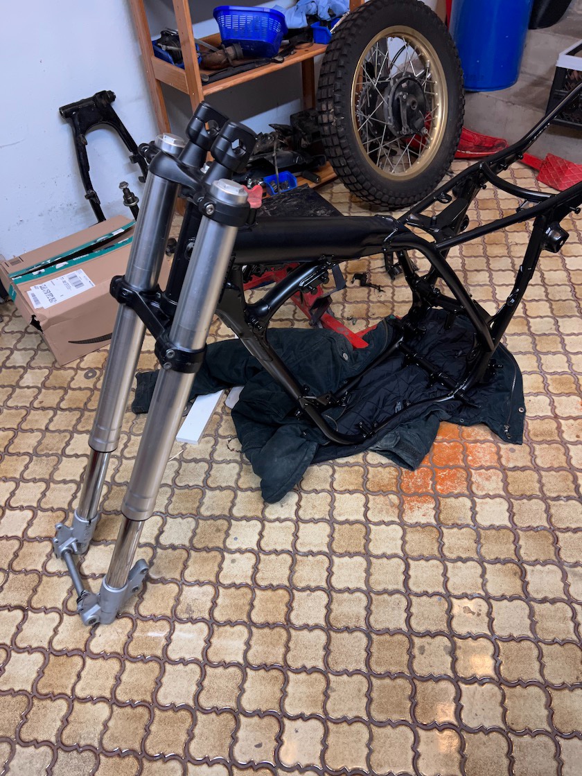An den Fußrastengewinden der Schwinge lässt sich super ein Montageständer anschrauben, dann steht die Kiste zum Schrauben stabil.