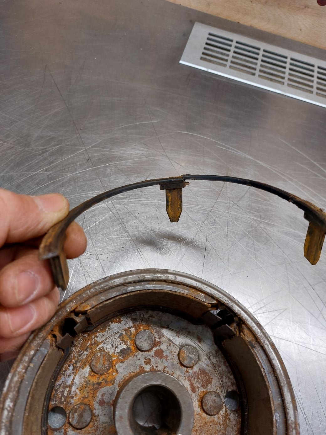 links 12V, rechts 6V 12V: und hier beim zerlegen...was wirklich sehr kniffelig und mühsam ist, da muss man ganz langsam und vorsichtig den oberen Kunststoffring raushebeln...der bicht da auch schon mal, ist jetzt aber nicht sooo schlimm, der sitz oben im Polrad in einer Nute...mit ein bißchen Kleber bekommt man das schon hin ...diese Bleche hier sind die Übertäter, die rosten bei Feuchtigkeit schnell und drücken sich dann von den Magneten weg nach innen und schleifen dann an den Spulen!
