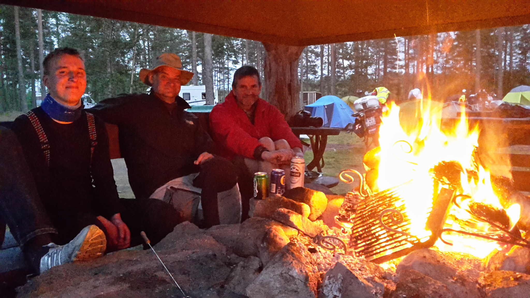 Noch am Abend hatten wir beschlossen eine Stunde später aufzustehen. Als ich kurz nach 0700 aus dem Zelt krabble, hat Clemens das Feuer schon wieder entfacht, um sich Rührei mit Speck zu braten. Zum Ende der Packphase fängt es an zu regnen. Natürlich. Es wundert uns schon fast nicht mehr. Um 0900 geht es los und Lippi führt uns auf kleinen Wegen und Pisten durch leichten Starkregen nach Oulu zu BILTEMA. Mehrere Fahrer wollen sich gerne neue Batterien kaufen, da ihre Elektrik versagt hat. Eigentlich findet jeder etwas bei BILTEMA. Martin Fahrradpedale, Matthias Öl, ich trockene Handschuhe und Hagen ein Handy. Ja, ihr lest richtig. Er hat sich bei BILTEMA ein Handy gekauft. Modell: The Brick. Sieht aus wie ein Funktelefon aus den 80ern. Damit kann er telefonieren und SMS schreiben. Ok und es hat einen Wecker und ein Radio. Smart ist es nicht. Wir vermuten, dass das an der Uni cool ist. Wir fahren weiter etwa 200m zu McDo, da es eh Zeit für Mittag ist. Danach führt uns Lippi weiter um die Wolken herum oder voll durch. An einer Stelle fahren wir 500m durch Hagelkörner, die überall auf der Strasse liegen. Ein Glück, dass wir die nicht abbekommen haben. Tanken, einkaufen und 35km später einen Wildcampingplatz suchen. Wiedereinmal ein Wendeplatz am Ende einer Sackgasse. Aufbauen, kochen, essen, Lagerfeuer. Tagesetappe 365km, ich habe Gesamt 5.165km, die anderen etwa 4.650km.