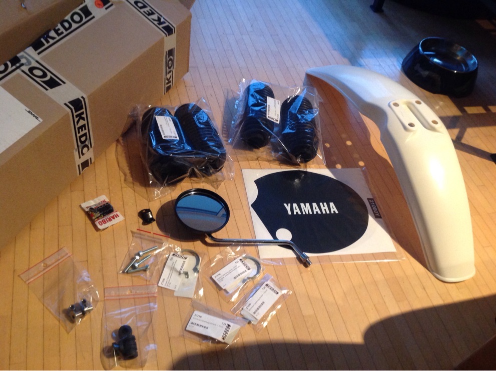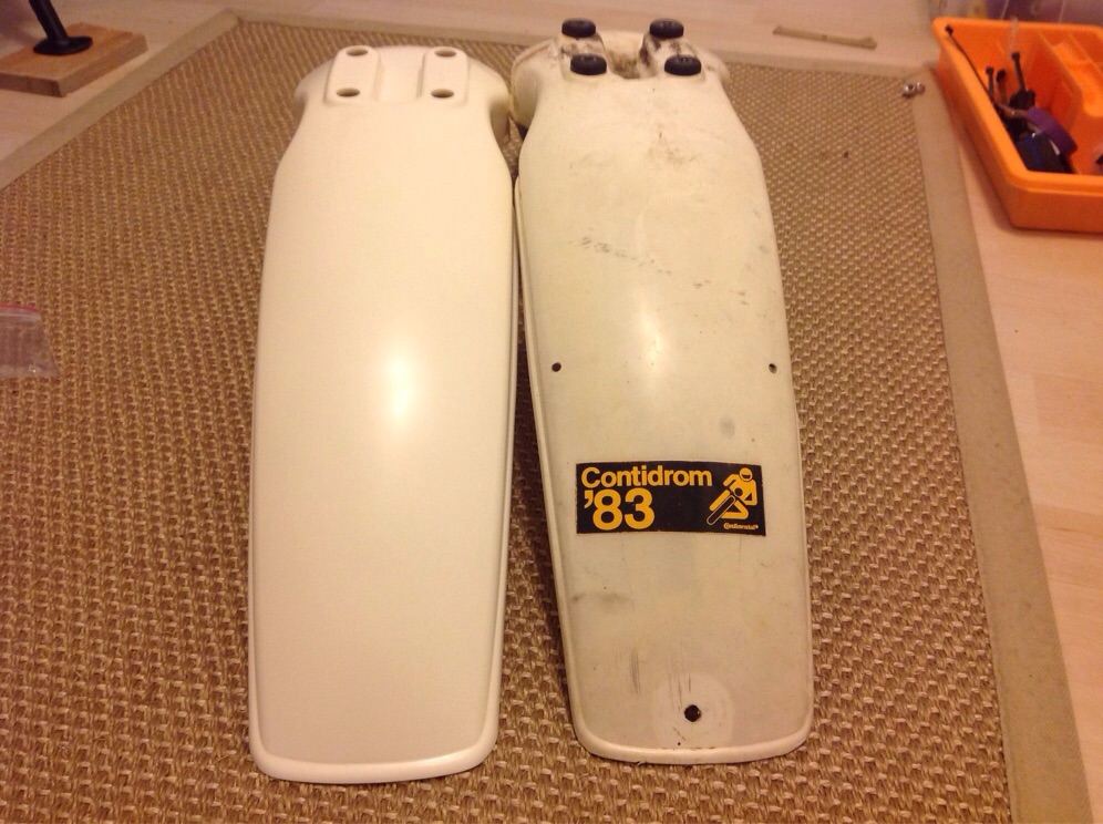 Neuer Frontkotflügel mit Befestigungsmaterial (warum sind eigentlich bei mir der alte Kotflügel mit 4 Sechskantschrauben angebracht und beim neuen Kotflügel sind so Inbusschrauben bei?!), neuer Spiegel (der jetzige ist gewürgt dran, mit so Kaugummidichtungsmasse, ich glaube das Gewinde stimmt nicht), neue Faltenbeläge (beide richtiges Baujahr