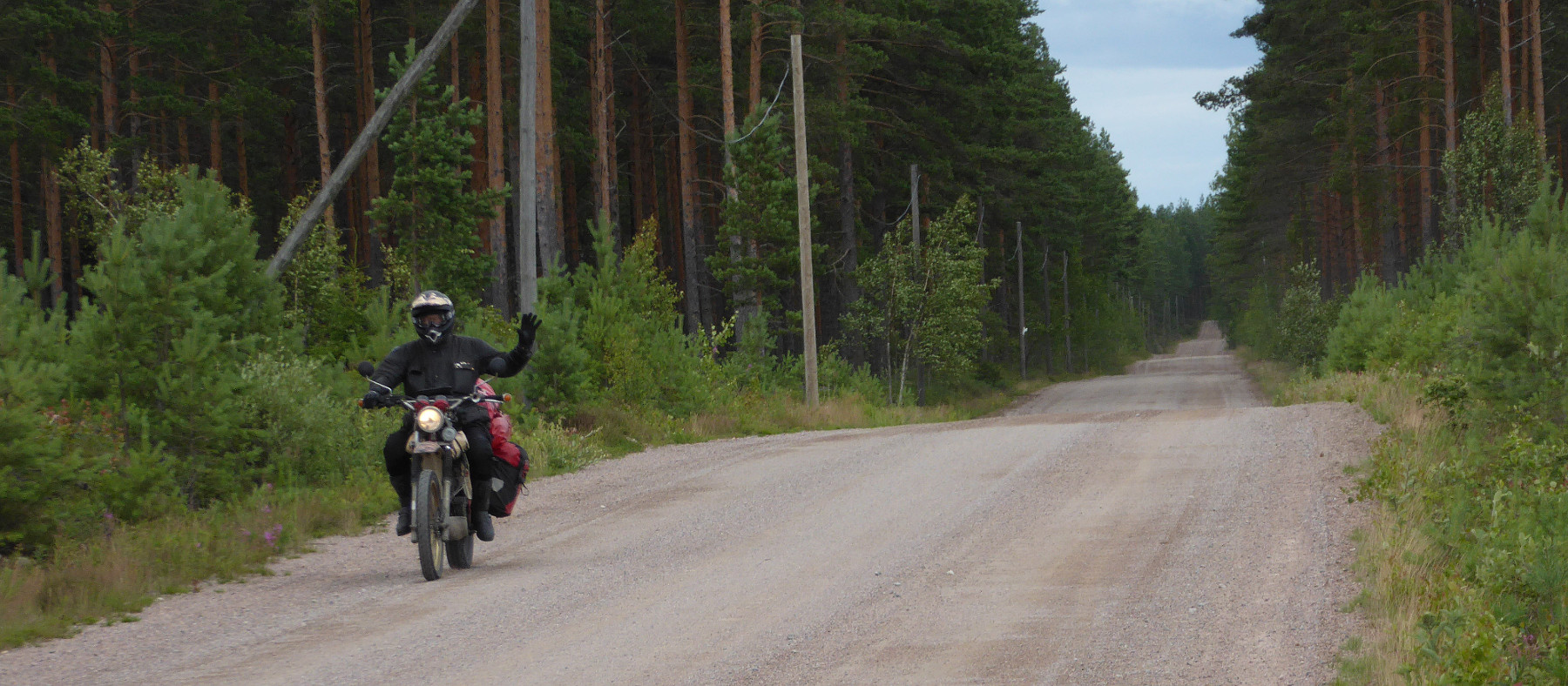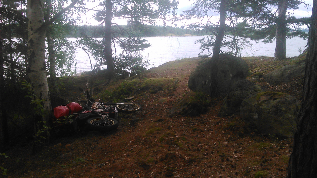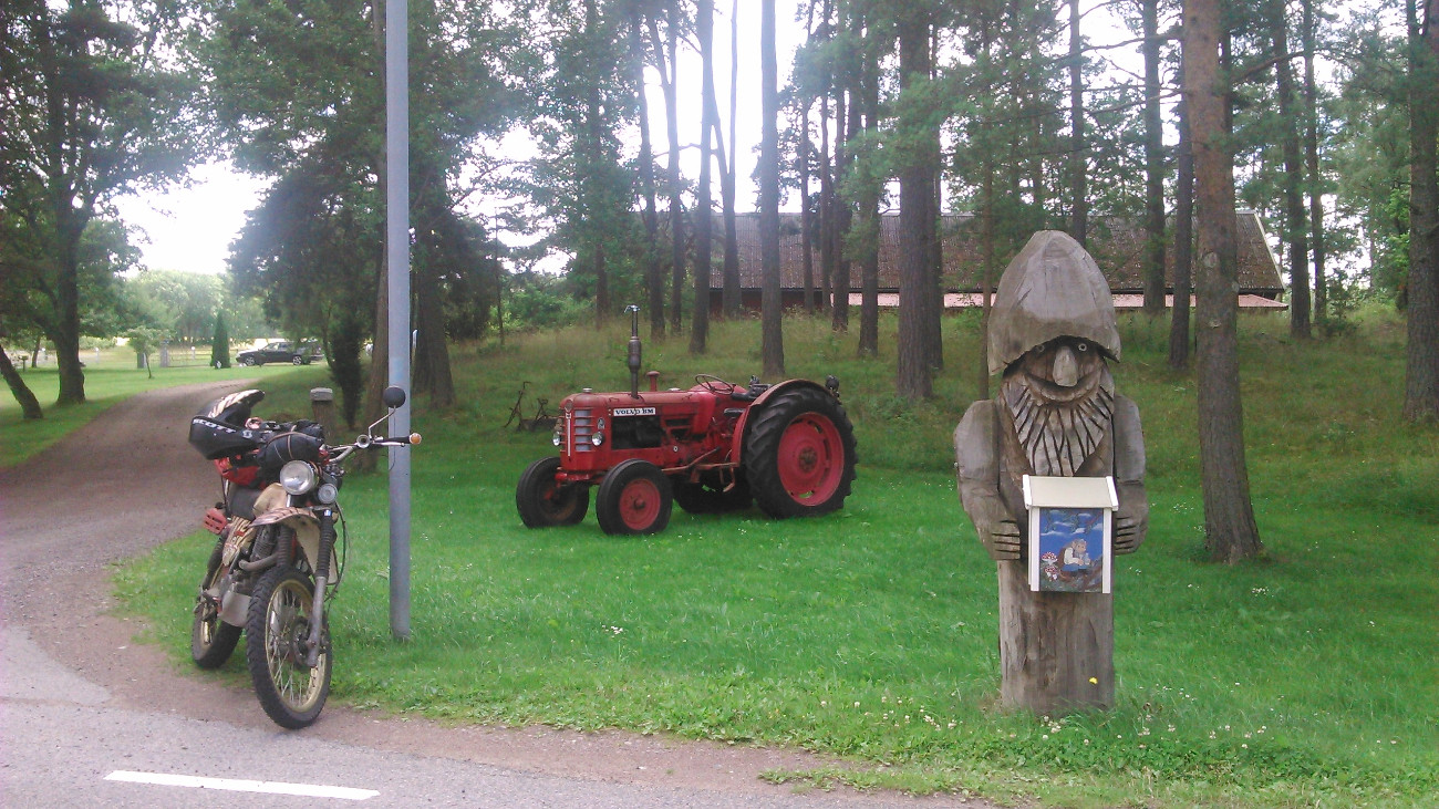 Um halb elf war ich mit dem Morgengeschäft fertig, hatte aufgeladen und das Ganzkörperkondom übergezogen. Dann kam ich mal langsam in die Pötte, und als erstes ging es zur Tanke. Nachdem alle Beteiligten satt und tatendurstig waren, ging es los, über Buskhyttan in Richtung Ö Husby. Das liegt auf der anderen Seite eines Fjordes namens Bråviken, und die Fahrt über die miniwinzige Straße am Fjord längs reizte mit einladenden Waldwegen und durch die Bäume hinweg war immer wieder das Wasser zu sehen, der Regen machte gerade Pause, also jedenfalls bei und hinter mir.