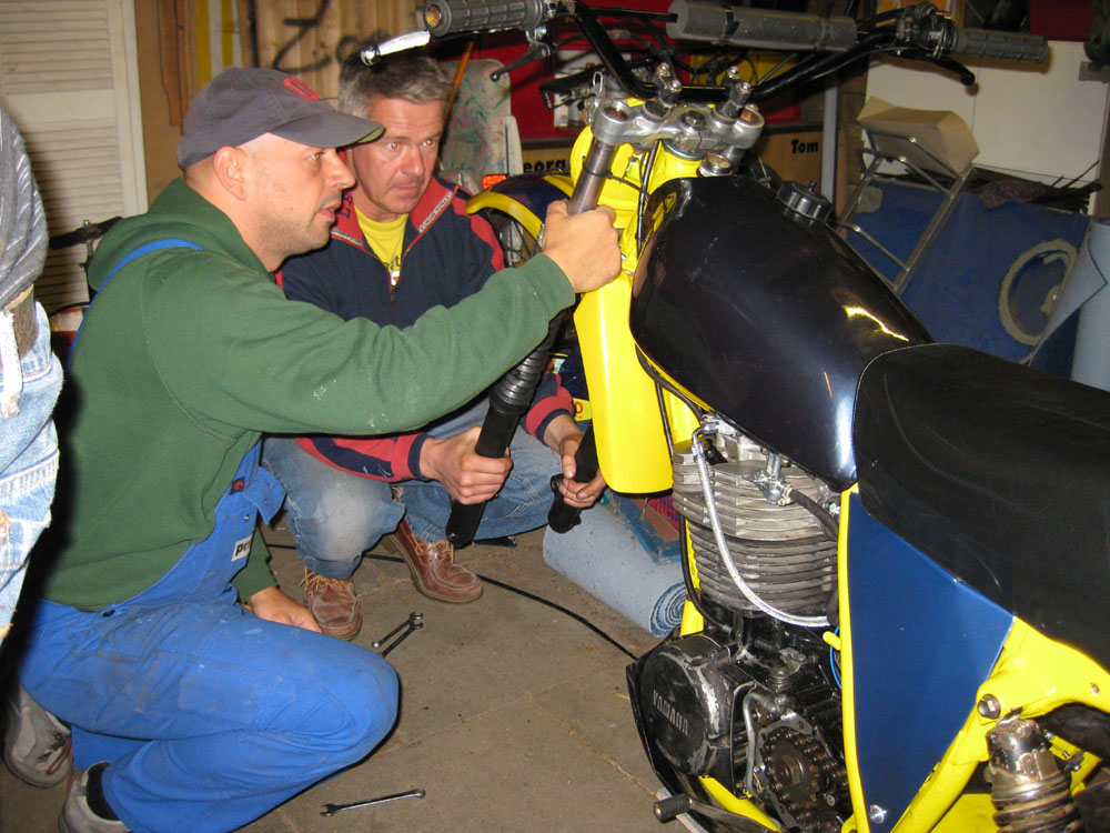 Der arme Frank ist nur knapp fertig geworden. Seit letzten Dienstag haben wir uns 2x getroffen, damit er noch fertig wird. Gut sieht sie aus, die XT, aber so richtig laufen will sie nicht. Dazu kommt, dass der Aupuff zu laut ist, um damit Probefahrten zu machen. (Aussage der Nachbarin: "Warum muß das denn ohne Auspuff sein?")