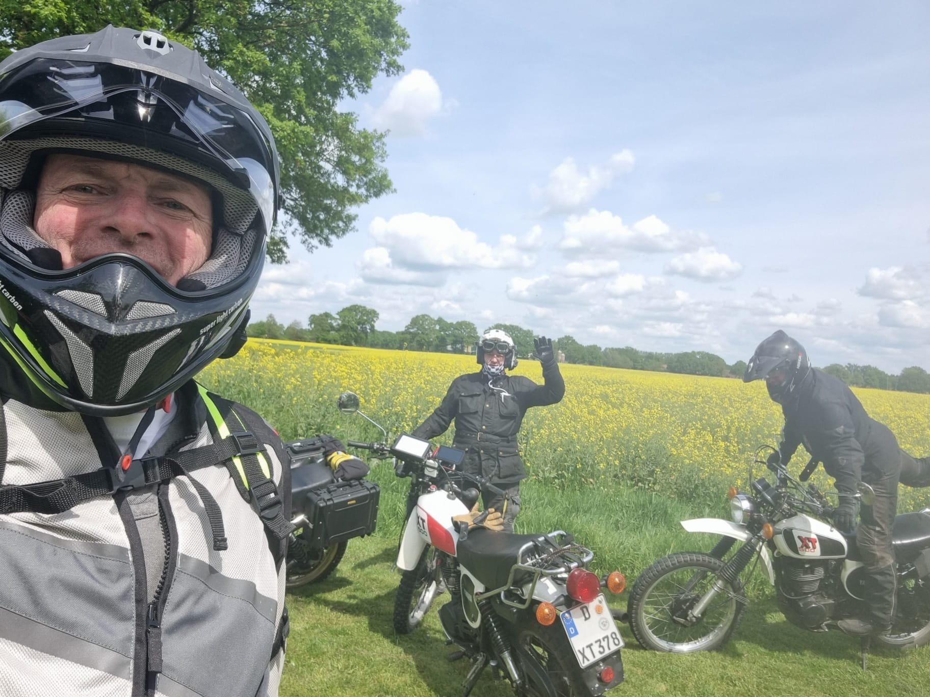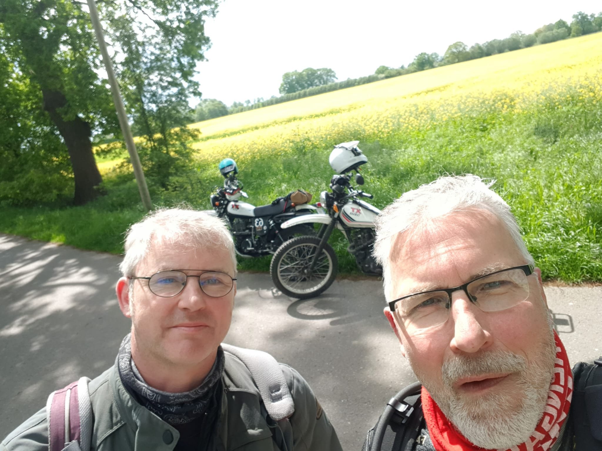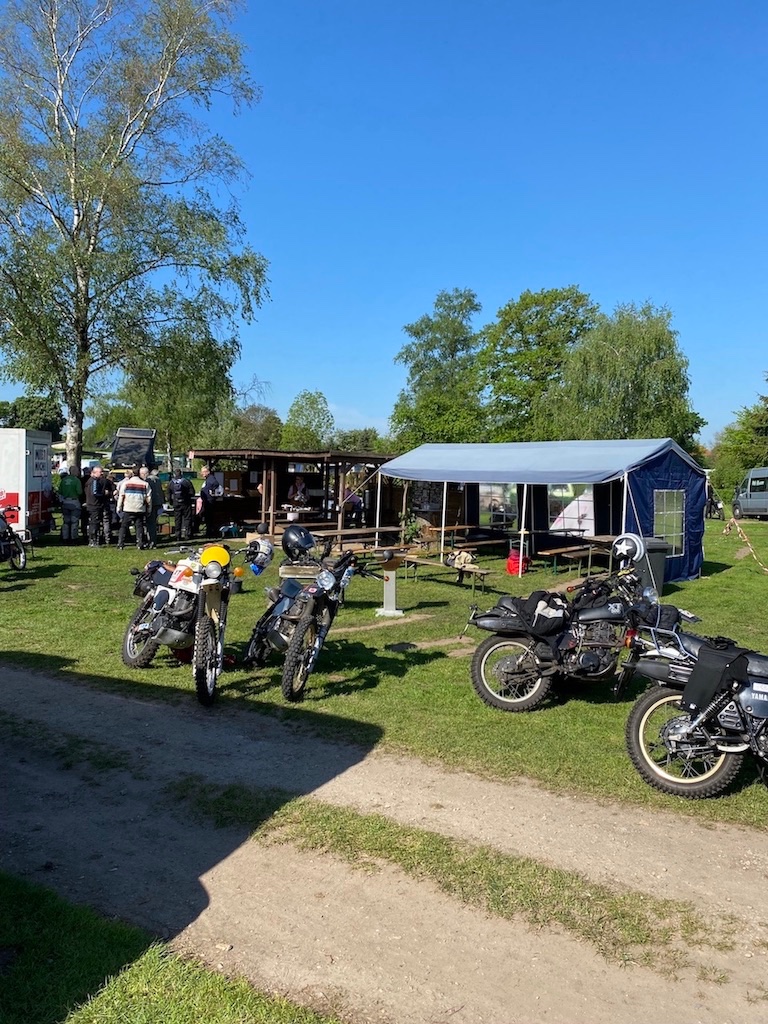 Wir hatten eine erschwerte Abfahrt. Von allen verabschiedet, Gepäck aufgeladen, Catherines XT250 gestartet, geht aber sofort aus, sobald man den Gasgriff 1 mm bewegt. Großes Rätselraten. Choke rein oder raus.. kein Unterschied. Mac hat uns dann geholfen mit Schwimmer Kammer abbauen, Hauptdüse checken, Kerze wechseln, Luftfilter Kasten aufschrauben mit Bremsen Reiniger versuchen zu starten. Nix hat geholfen. Wir wollten gerade eigentlich den ADAC anrufen damit Catherine mit XT nach Hause kommt, dann fiel mir noch was ein…es hatte ja die ganze Nacht geregnet und die XT lief bei der Mai O Fahrt am Vortag richtig prima. Kann dann eigentlich ja doch nur mit dem Regen zusammen hängen war so mein Gedanke, obwohl alles auf den Vergaser hindeutete. Ich also den Kill Schalter und das Zündschloss ein paarmal hin und her bewegt wieder gestartet und siehe da alles prima, die XT hat sich gefreut und hatte willig Gas angenommen. Welch Erleichterung. Ich vermute, dass im Killschalter Wasser war, mit selbigem wird ja die Zündspule auf Masse geschaltet. Sind dann gemütlich über Land in 7h18min wieder in Düsseldorf angekommen. Meine 79er hatte auch noch eine Panne. Die Batterie Kabel waren etwas lose. Somit hatte ich fast keine Blinker und keine Hupe mehr und das Navi wollte nicht mehr geladen werden. Das haben wir dann beim Tankstop gefixt.