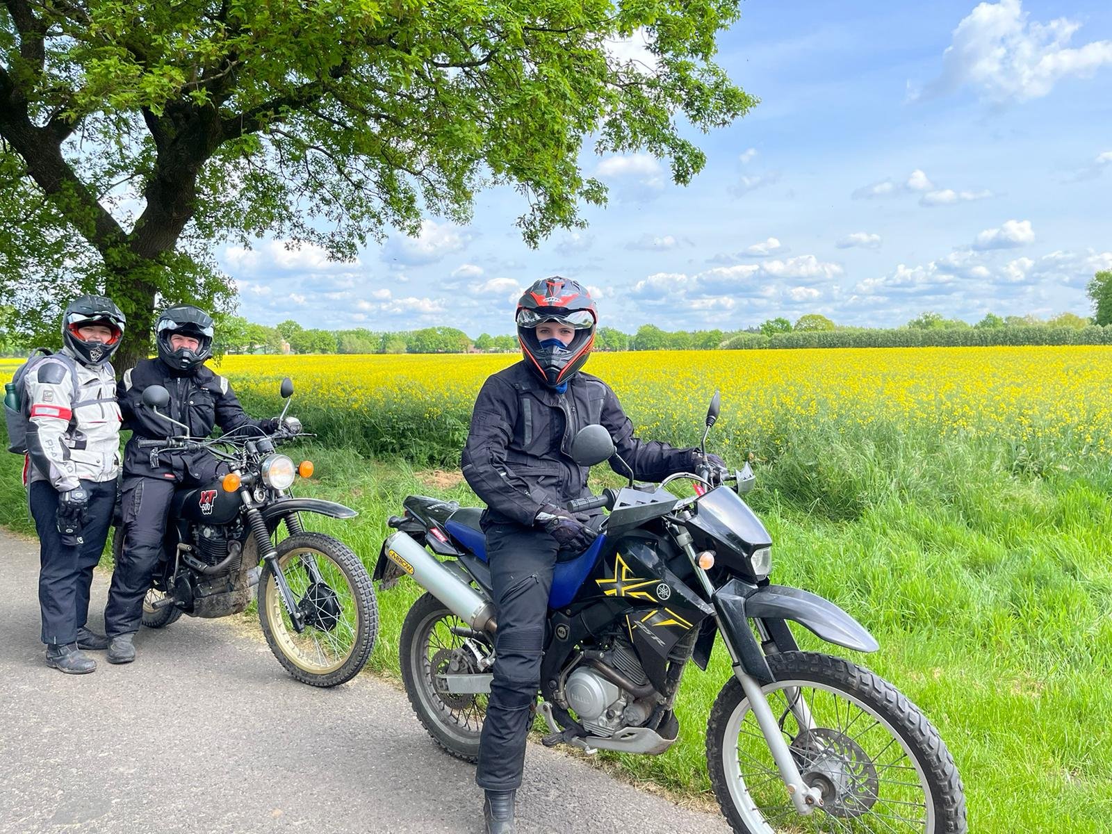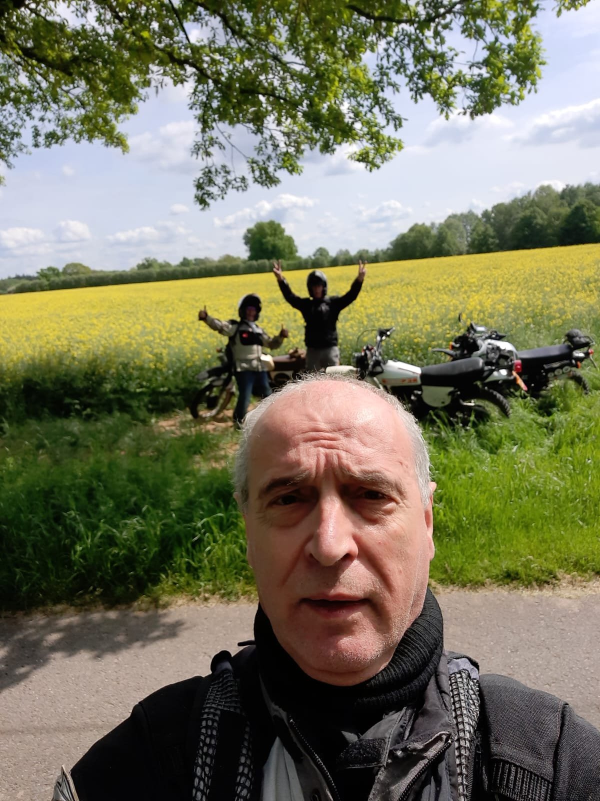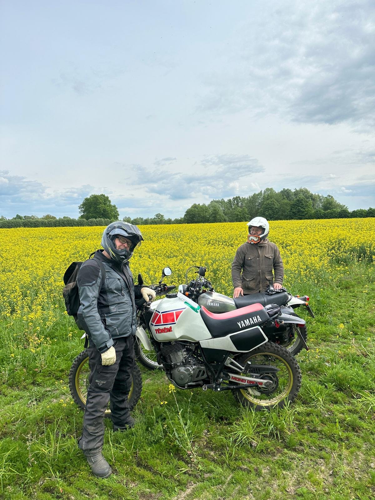 Wir hatten eine erschwerte Abfahrt. Von allen verabschiedet, Gepäck aufgeladen, Catherines XT250 gestartet, geht aber sofort aus, sobald man den Gasgriff 1 mm bewegt. Großes Rätselraten. Choke rein oder raus.. kein Unterschied. Mac hat uns dann geholfen mit Schwimmer Kammer abbauen, Hauptdüse checken, Kerze wechseln, Luftfilter Kasten aufschrauben mit Bremsen Reiniger versuchen zu starten. Nix hat geholfen. Wir wollten gerade eigentlich den ADAC anrufen damit Catherine mit XT nach Hause kommt, dann fiel mir noch was ein…es hatte ja die ganze Nacht geregnet und die XT lief bei der Mai O Fahrt am Vortag richtig prima. Kann dann eigentlich ja doch nur mit dem Regen zusammen hängen war so mein Gedanke, obwohl alles auf den Vergaser hindeutete. Ich also den Kill Schalter und das Zündschloss ein paarmal hin und her bewegt wieder gestartet und siehe da alles prima, die XT hat sich gefreut und hatte willig Gas angenommen. Welch Erleichterung. Ich vermute, dass im Killschalter Wasser war, mit selbigem wird ja die Zündspule auf Masse geschaltet. Sind dann gemütlich über Land in 7h18min wieder in Düsseldorf angekommen. Meine 79er hatte auch noch eine Panne. Die Batterie Kabel waren etwas lose. Somit hatte ich fast keine Blinker und keine Hupe mehr und das Navi wollte nicht mehr geladen werden. Das haben wir dann beim Tankstop gefixt.