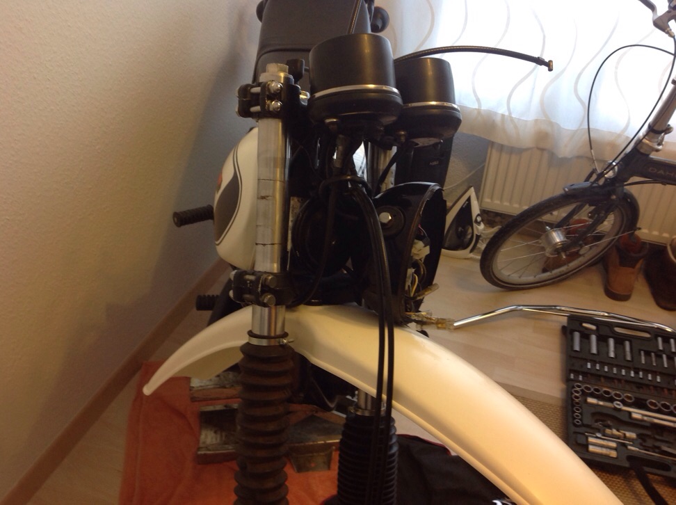 Von vorne bis hinten wurde die XT dann durchgescannt und die Neuteile montiert. Gabel raus und neue Faltenbeläge dran. Gabel höher gesetzt, Lampenhalter höher gesetzt (nun scheint das 6Volt-Lichtlein nicht mehr nur auf den Frontkotflügel...), ein paar rostige Schrauben ausgetauscht. Neuen nun chromfarbenen Lenker montiert mit dem neuen Kupplungshebelhalter, nun passt auch der neue Spiegel.