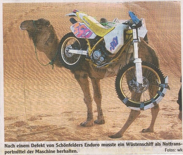 Dass der Trip aber durchaus unangenehme Überraschungen birgt, weiß Schönfelder aus eigener Erfahrung: Bei seiner ersten Wüstentour hatte seine Enduro einen Motorschaden. Der kilometerlange Rücktransport zur Oase erfolgte auf ebenso ungewöhnliche wie kuriose Art: Ein gemietetes Kamel nahm die Maschine huckepack.