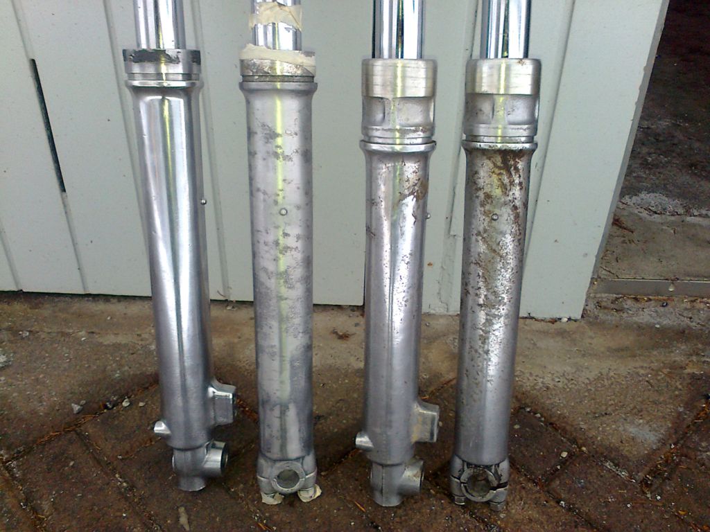 die Linke ist eine Gabel für 76/77 mit kurzer Aufnahme an den Tauchrohren für die Staubkappen anstatt Faltenbälgen. Die Standrohre waren etwas kürzer und hatten oben keine Einschnürung, weil die Gabel durchgesteckt war und die Lampenhalterung in diesem Bereich verschoben wurde. Normalerweise hat diese alte Gabel auch die Alustopfen mit Außensechskant.