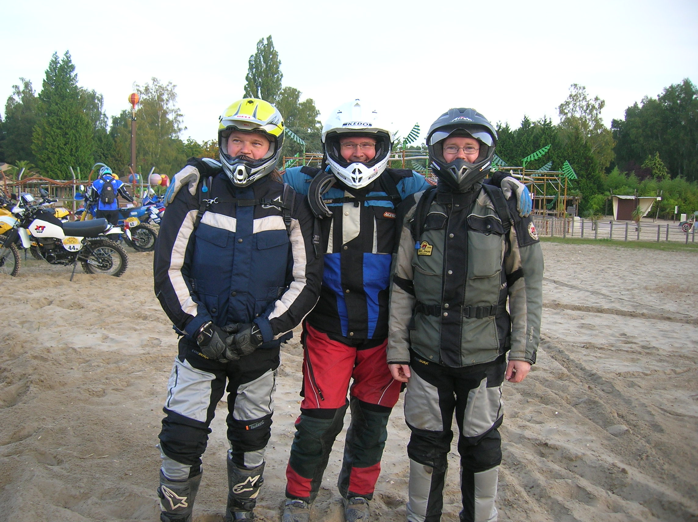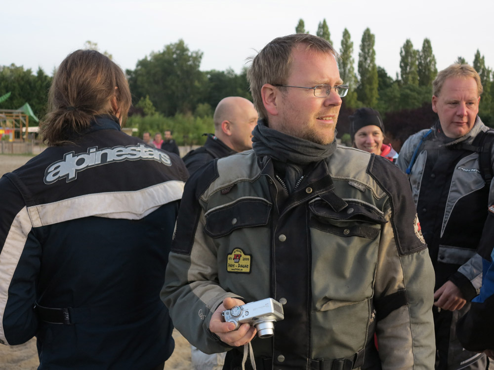 In St. Witz laden wir aus und bringen die XTs in den Parc Fermé. Wir erledigen die Dokumentenabnahme und die technische Abnahme. Außerdem lernen wir Jörg V. kennen (auf dem Foto der zweite von Links), der schon letztes Jahr auf seiner gelben XT dabei war.