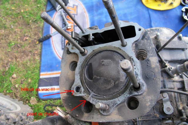 Am Abend in Sancerre auf dem Campingplatz helfen wir Jörg V. seinen Motor zu zerlegen. Seine Kopfdichtung ist durch ... leider nicht ohne Grund - ein Stehbolzen war mit Helicoil eingesetzt und ist nun herausgerissen.
