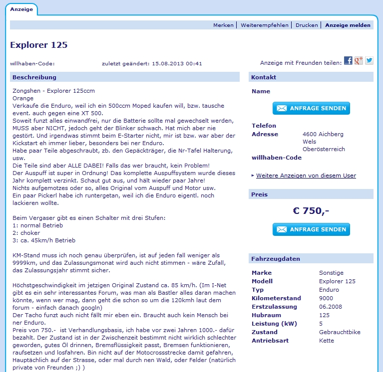 sorry ... dachte eigentlich, dass das anders rüber kommt ... ich hatte das Inserat selbst so "köstlich" geschrieben gefunden (der schräge Schreibstil ... und die Mängel mit denen er so stückerlweise rausrückt - und die konstruierten Argumente, weshalb die kein Problem seien) ... die Tauschmöglichkeit war quasi "der Aufhänger" ums hier zu posten, bzw. der "Drüberstreuer", dass jemand sowas (sowohl Fahrzeug als auch Zustand) gegen eine XT tauschen möchte :-)