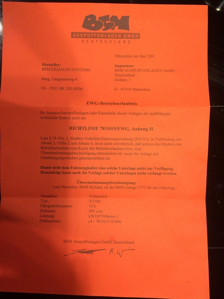 I have just bought my first XT500 H, 1981 and I am trying to get it approved by the Norwegian authorities. It has previously been approved both in the Netherlands and Sweden but