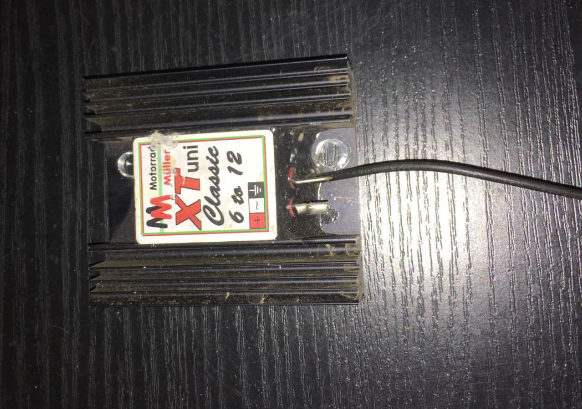 Die 12V waren irgendwann Pflicht für mich. Zu dem Zeitpunkt als ich das da Umsetzen wollte, war der hier auch viel erwähnte Röbi-regler wohl nicht greifbar. In einem Beitrag, wo es um 12V Möglichkeiten ging, gab es dann den Hinweis auf Motorrad-Müller, der einen 12V Regler anbietet. Das wollte ich probieren.
