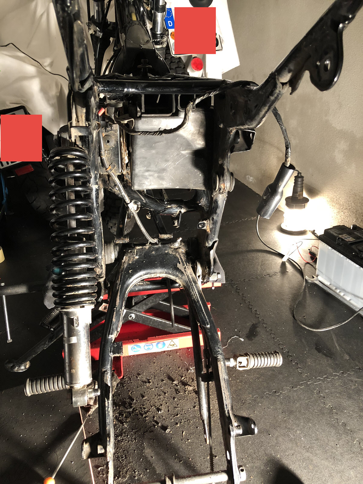 Der Motor ist schon raus und weil ich einen neuen Kettensatz brauche habe ich auch das Hinterrad demontiert.