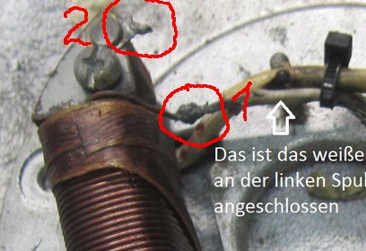 die Lötstelle im Kringel 1 abzwicken, (das weisse Kabel ist dann überflüssig) und den Spulendraht an die angenietete Lötöse in Kringel 2 anlöten. Dazu bitte frisches Lötzinn verwenden