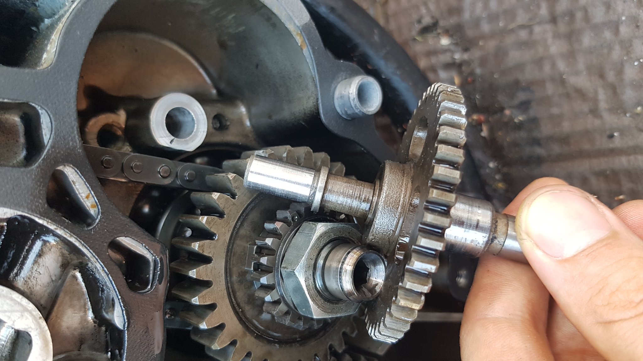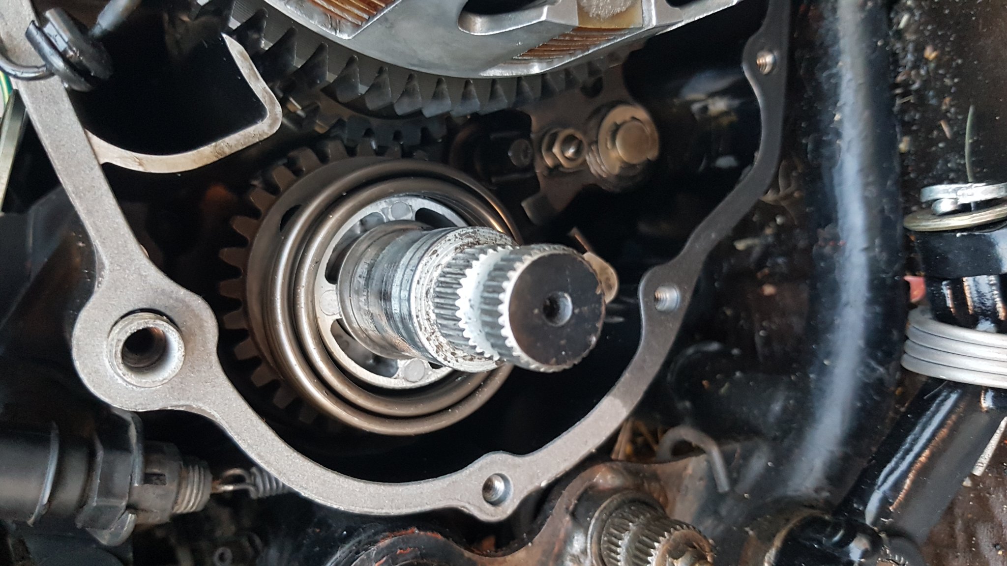 Die Distanzscheibe von der Unterbrechernockenantriebswelle habe ich versucht mit einer Pinzette aus dem Gehäuse zu pfriemeln, dabei ist die Distanzscheibe von der Pinzette abgerutscht und verschwunden. Habe mit einer Taschenlampe und einem Draht gesucht, aber finde sie einfach nicht. Auch das Motorrad auf die rechte Seite zu drehen und zu schütteln hat nichts gebracht.