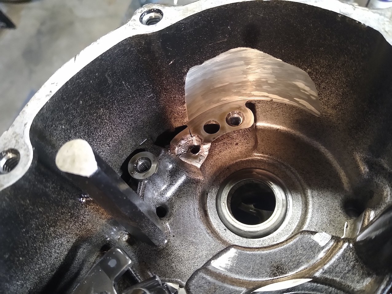 fast wäre ich heute fertig geworden mit dem Motor: keine Schrauben abgerissen, keine Gewinde durch, eigentlich alles in wirklich gutem Zustand. Ich war grad so schön dabei die üblichen Dinger unter dem Kupplungsdeckel zu erledigen (Ölpumpe mit neuen Dichtringen versehen, Reste der Verlustscheibe entfernen, Simmering an der Kurbelwelle tauschen, Kugelventil tauschen), zusätzlich nehm ich dann das Anschlagblech raus und ersetze es mit einem ohne scharfe Kanten. Darunter kam dann leider das zum Vorschein (siehe Foto).