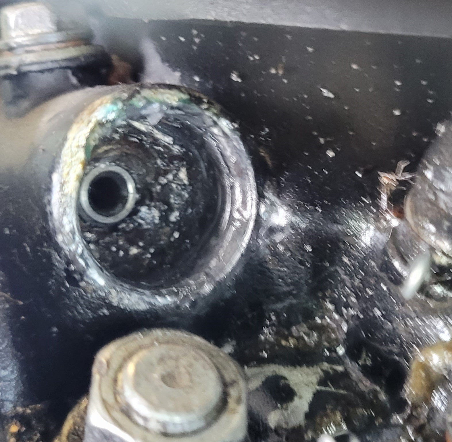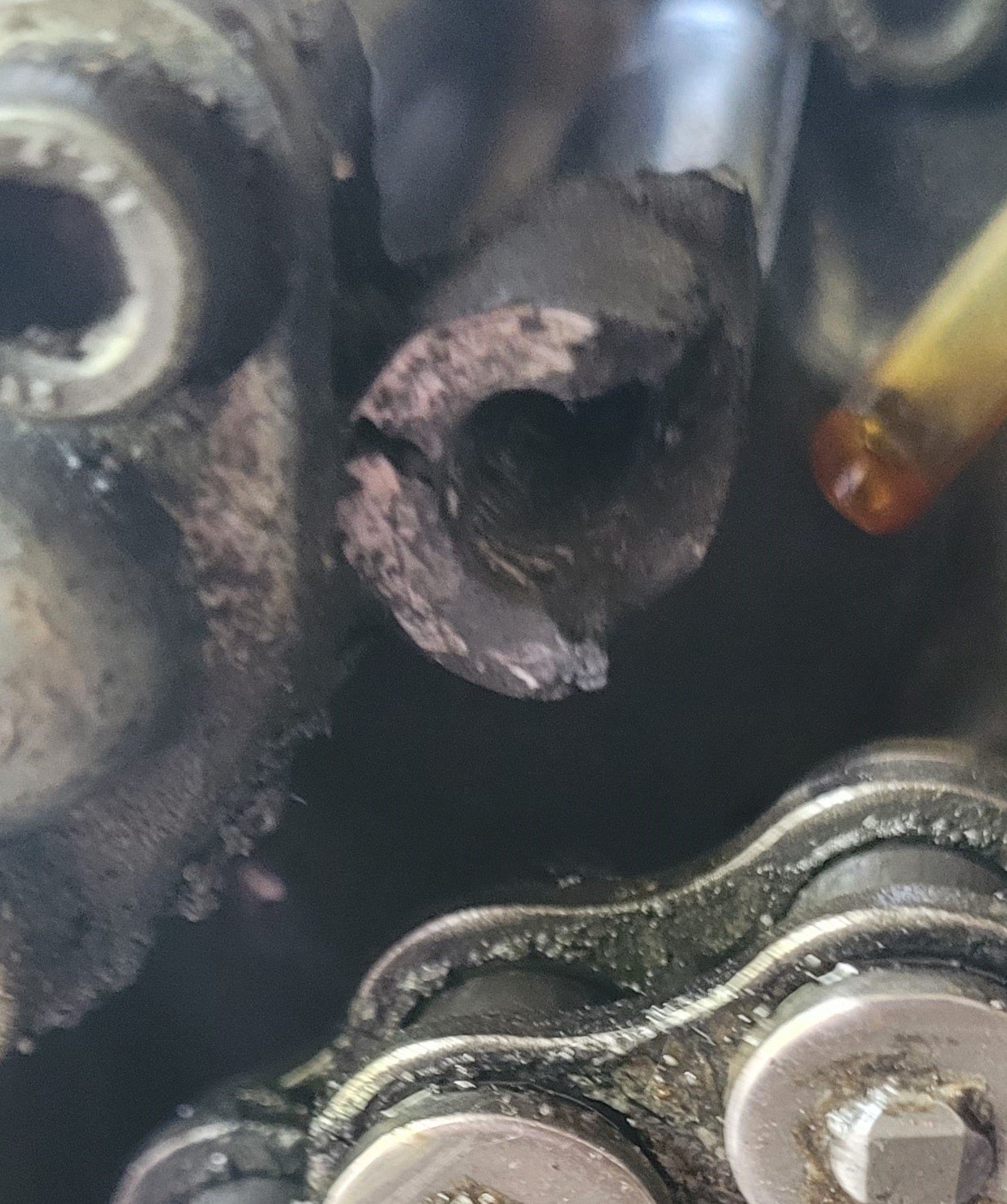 Mir ist heute aufgefallen, dass sie nach einiger Zeit im Standgas etwas Öl am Zylinderkopf vorne absondert. Der Grund ist wohl eine absolut defekte Aufnahme der Drehzahlmesserwelle. Ich bin mir nicht sicher, ob "nur" oben etwas ausgebrochen ist, oder alles drumherum abgebrochen ist. Die Welle müsste doch viel weiter drin stecken? Ich habe versucht sie mit einer Zange weiter reinzuschieben, geht nicht. Drehzahlmesser selber reagiert fast gar nicht, zeigt mir Drehzahl 3000 an, wenn ich sie hochtouren lasse. Kann man da was reparieren oder soll ich die Aufnahme "versiegeln" und abdichten? Ich war beim Versuch die Ölundichtigkeit zu finden links von der XT gekniet, da kam mir (im Standgas) das Ding entgegen geflogen. Ich denke aus der Richtung Zylinderkopf. Es fühlt sich an wie Hartplastik oder ein extrem augehärteter Gummi. In der Mitte ist vorne & hinten mittig eine durchgehende Einkerbung. Könnt ihr mir sagen, was dieses UFO ist?