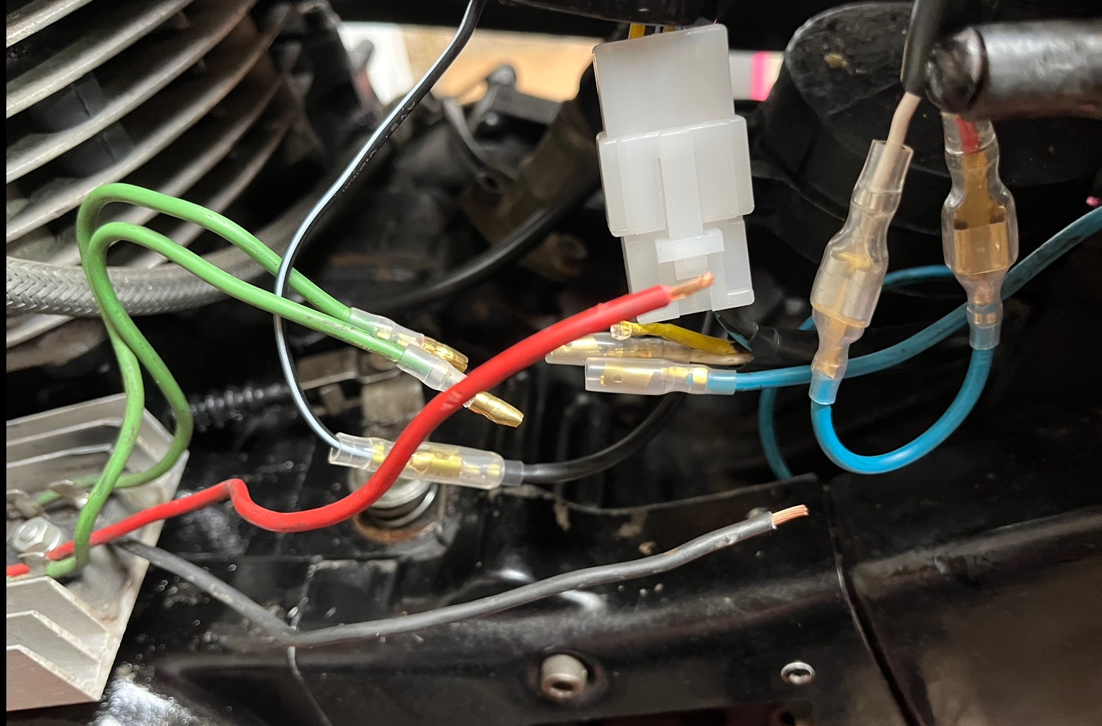 ...wenn nach Plan umgebaut wurde, kommt die weiße und die neue blaue Ader auf die beiden grünen am Regler. Rot ist Plus und Schwarz Minus/Masse. Die gelbe Ader ist funktionslos.